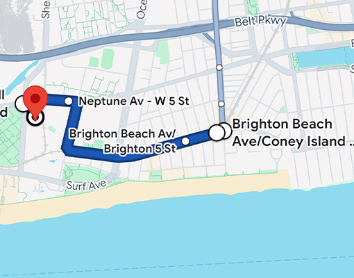 If the subway station is closed (for example, on weekends): take the B68 bus toward Coney Island and get off at Neptune Ave / West 6th Street, then follow the same walking directions.