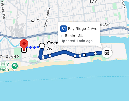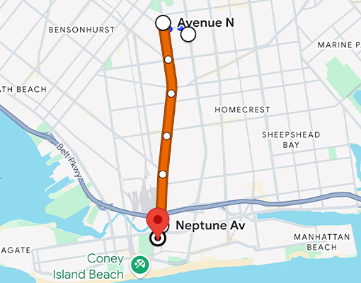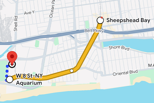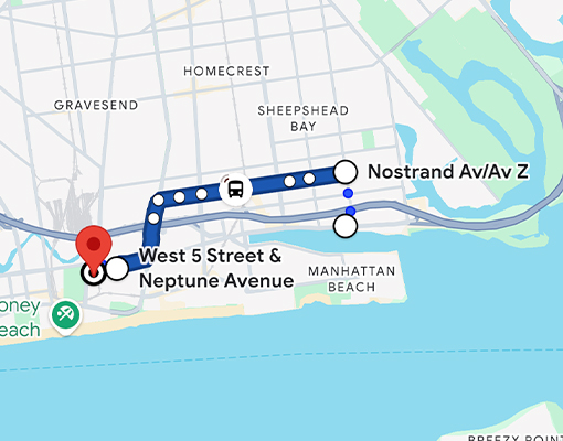 Follow the same walking directions via West 6th Street to Sheepshead Bay Road.
