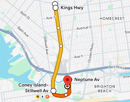 Take the F train from McDonald Ave & Kings Hwy to Neptune Ave / West 6th Street.
