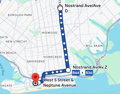 Take the B44 bus to Nostrand Ave / Ave V, transfer to the B36 bus, and get off at West 5th Street & Neptune Avenue.