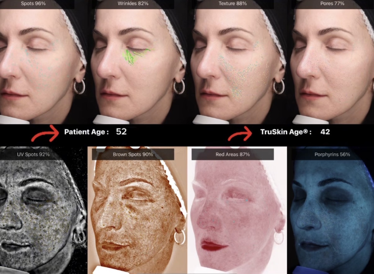 At the initial visit, a comprehensive skin assessment was performed at our Brooklyn Med Spa using the VISIA Skin Analysis System. This advanced diagnostic technology allows for an objective evaluation of skin quality, pore size, pigmentation, overall tone, and biological skin age.